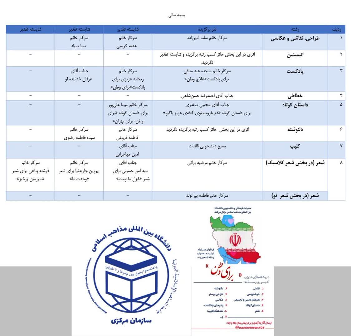 نتایج مسابقه سراسری تولید محتوا و رسانه با محوریت《برای وطن》 که به همت معاونت فرهنگی و دانشجویی دانشگاه بین المللی مذاهب اسلامی در واکنش به جنگ ۱۲ روزه در رشته‌های مختلف هنری، ادبی و رسانه برگزار گردید، پس از داوری با حضور اساتید و داوران برجسته، مشخص و اسامی برندگان به شرح زیر اعلام می‌ گردد.